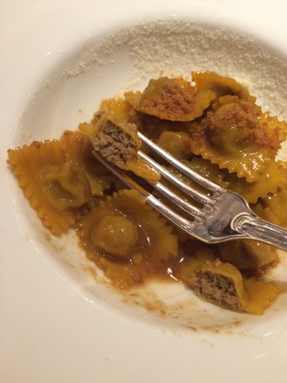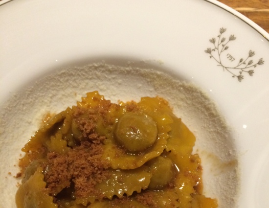 No doubt the shape is really sexy! His agnolotti are square and we say ‘gobbi’, hunchbacked. Pasta has a bright yellow color. It’s filled according the classic style of the three meats (beef, pork, rabbit), no vegetables. Dressed with meat sauce and butter, but here there’s more taste and sapidity, it’s more juicy but not less elegant. The meat sauce is just perfect, cooked with very high style. The dish is topped with toasted bread crumbs to add more texture and a rustic, household aroma. Taste is impressive: a satisfying and fulfilling experience! Again a sumptuous dish!