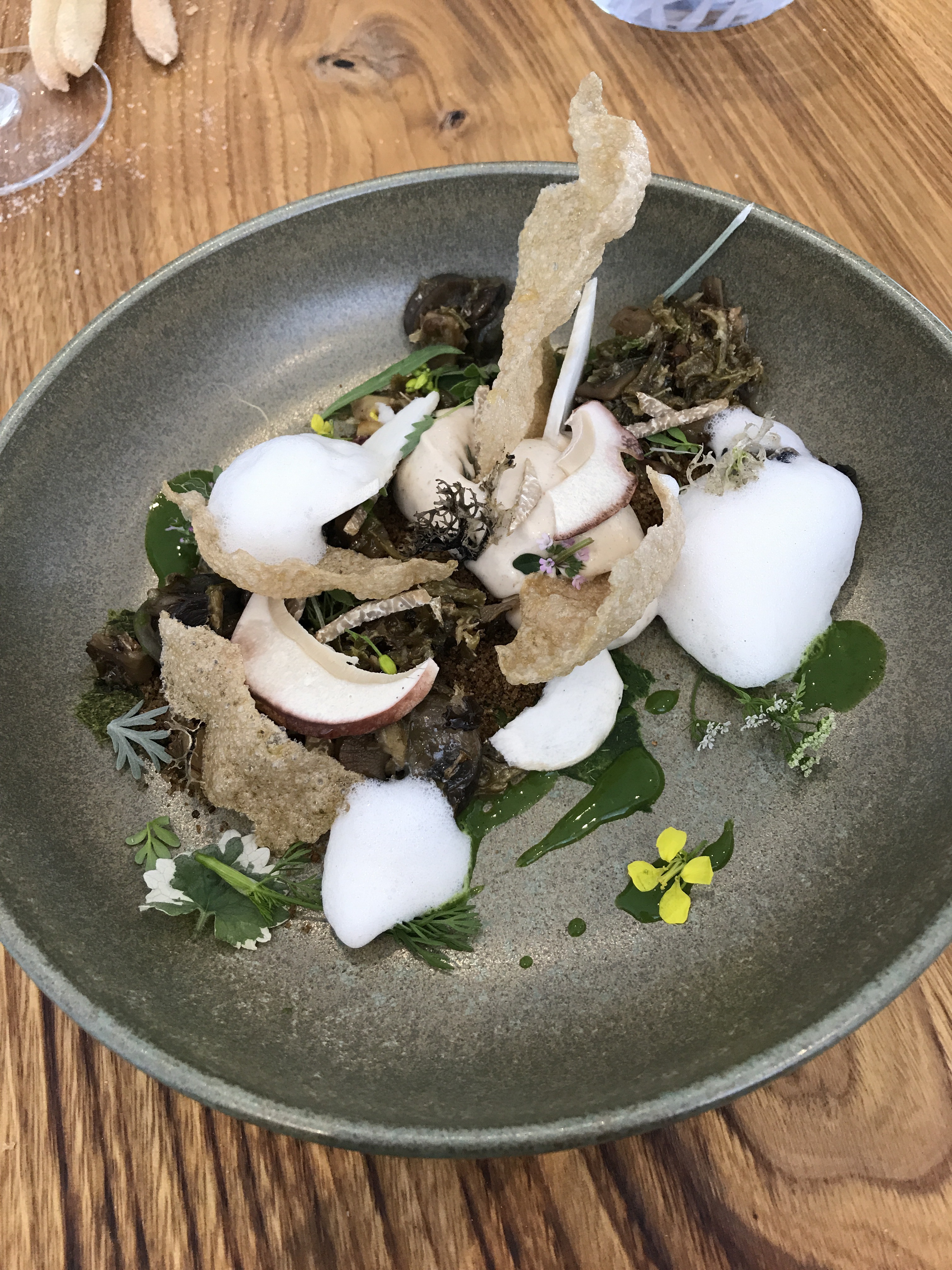 Il nuovo locale ha un’atmosfera più informale, giovane e moderna. In un ambiente luminoso e di design, si mangia su bellissimi tavoli e tavolini di legno senza tovaglia. La mano in cucina è la stessa che conoscevo, delicata, sapiente, con un senso estetico fuori dal comune. I piatti sono minimali e precisi. La proposta culinaria è molto personale, ancorata su due pilastri: profumi, sapori, prodotti locali delle montagne locali abbinati al neoclassicismo francese.