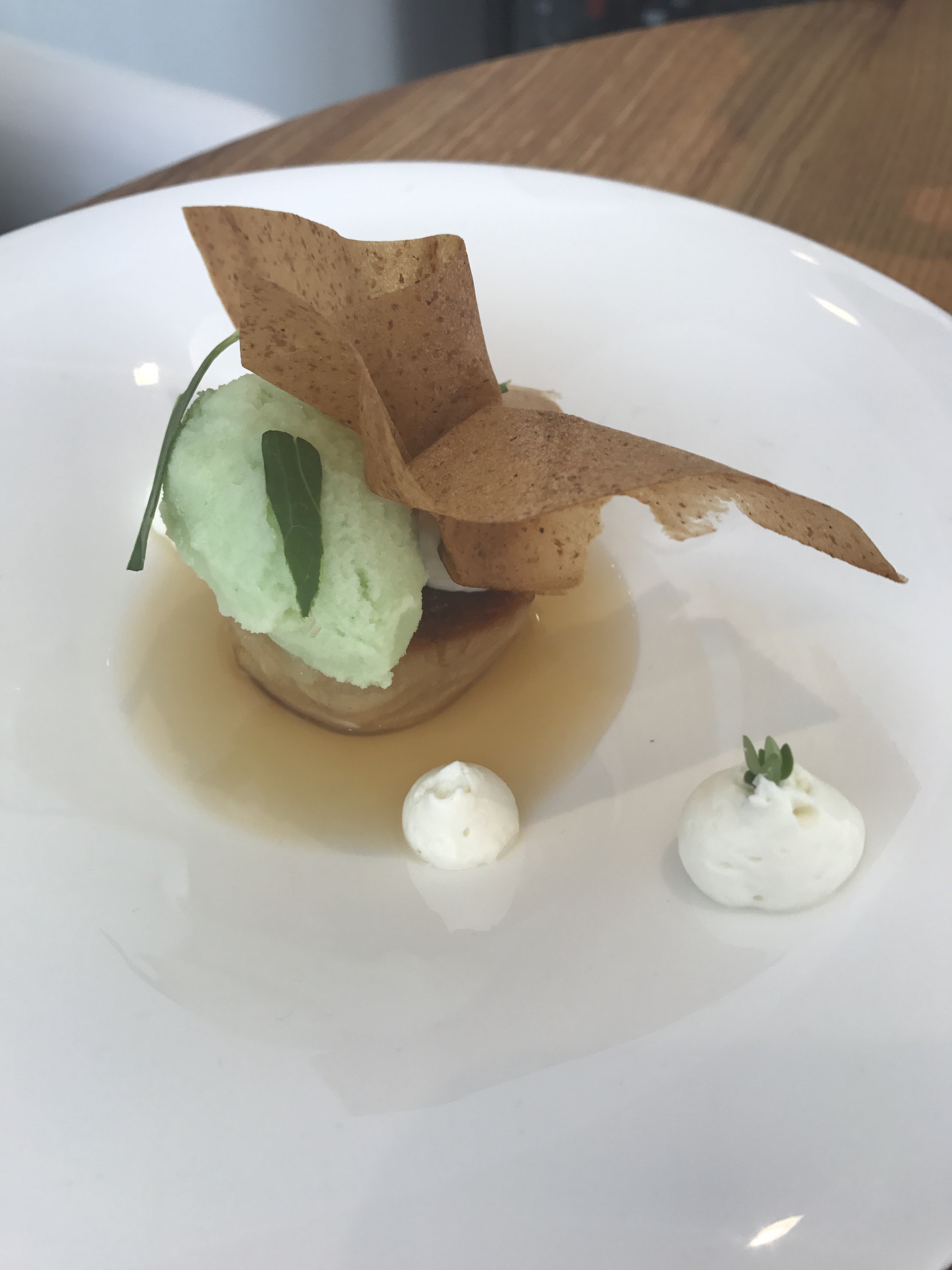 -Dessert: Mela, gelato al sedano, crema al levistico, cialda di mela.