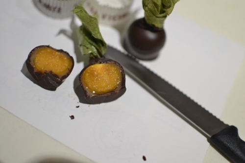 La friandise in questione risulta così dura e croccante all’esterno e morbida all’interno. Lo zucchero ed il cioccolato ben si combinano con la freschezza del frutto maturo: dimenticate quell’orribile sensazione acida dell’alkekengi non maturo abbinata al cioccolato amaro!