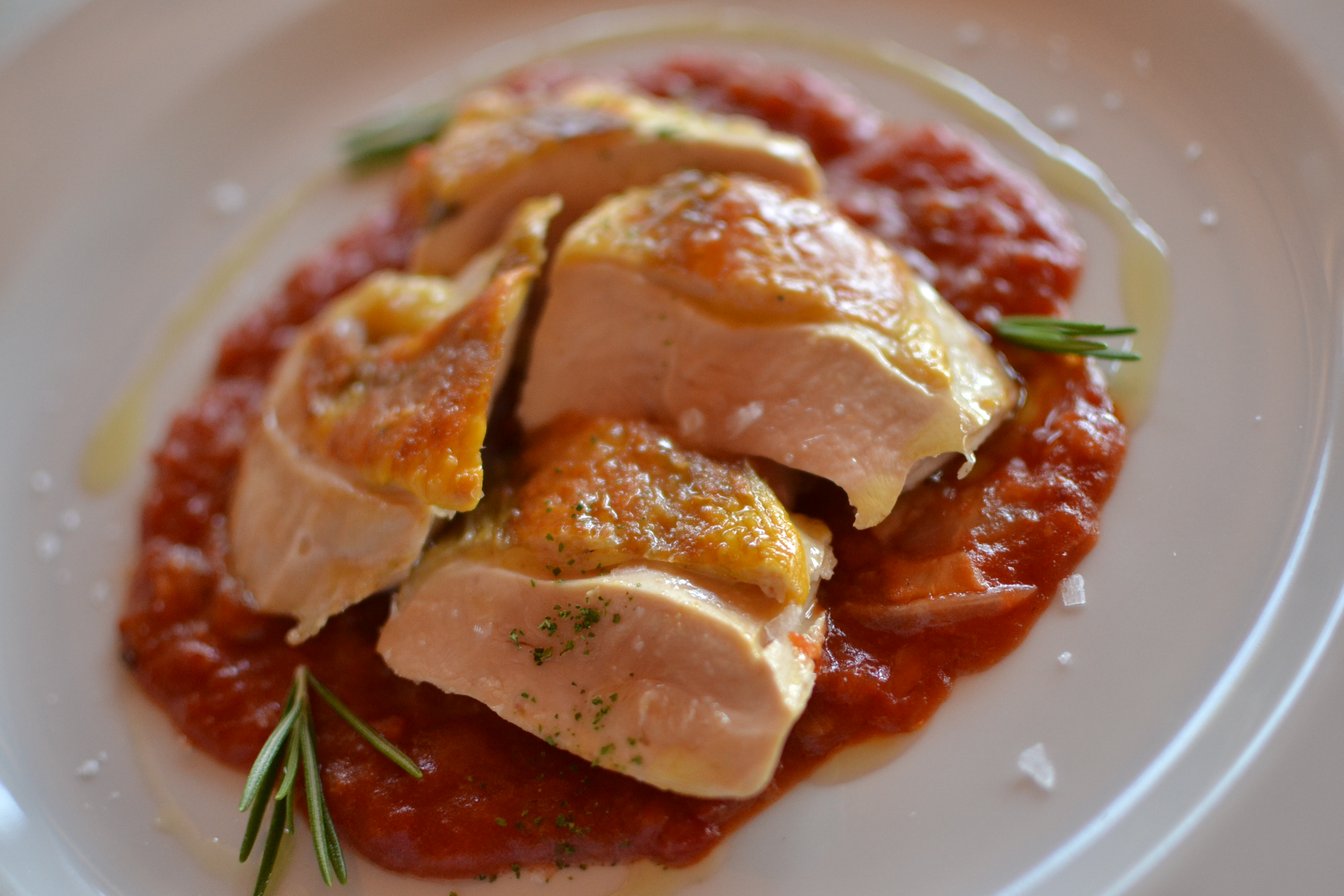 Guineafowl (Greppi farmer) breast is seared on the skin side and then laid on the classic tomato sauce with porcini.