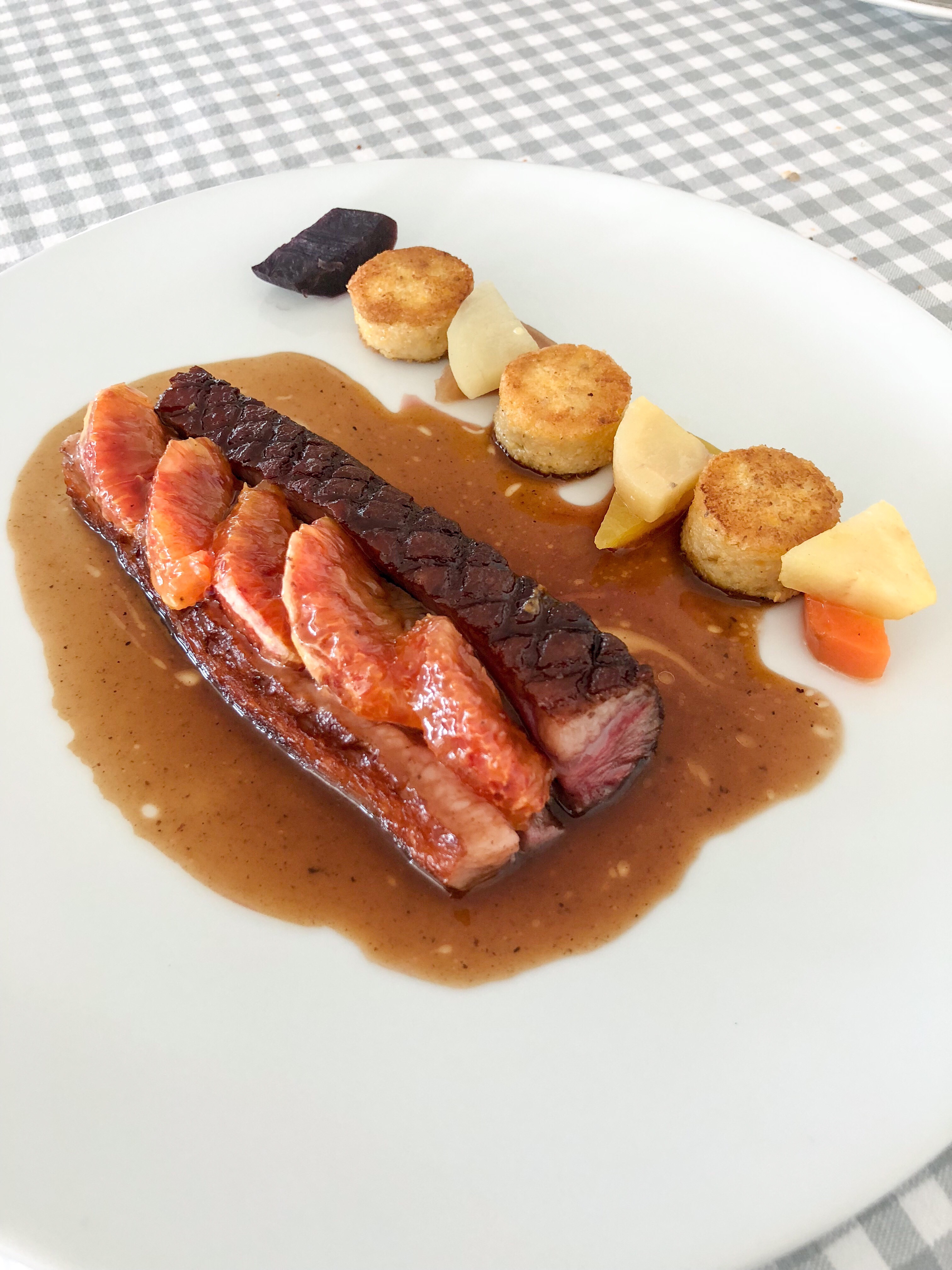 -Anatra all’arancia. Ho chiesto una cottura rosé. Il magret ha la pelle segnata e croccante, le arance sono ben caramellate ed il fondo di cottura ancora una volta é ineccepibile. Tra le verdure spiccano ancora i bottoni di polenta piastrati: l’ho già detto che i francesi sulla polenta sono mooolto forti? Eccone un esempio!