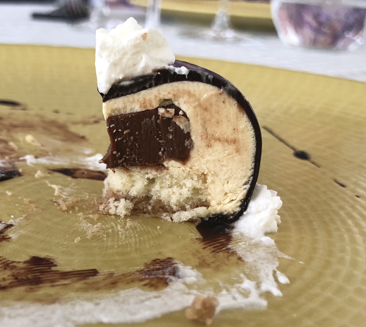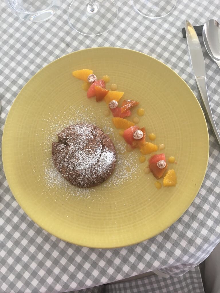 -Soufflé al cioccolato. Ancora un piccolo capolavoro: si sviluppa in orizzontale su un biscotto sablé e non in verticale cotto nell’apposita scodella. Di fianco piccoli frutti tra cui spicca l’arancia candita da urlo!
