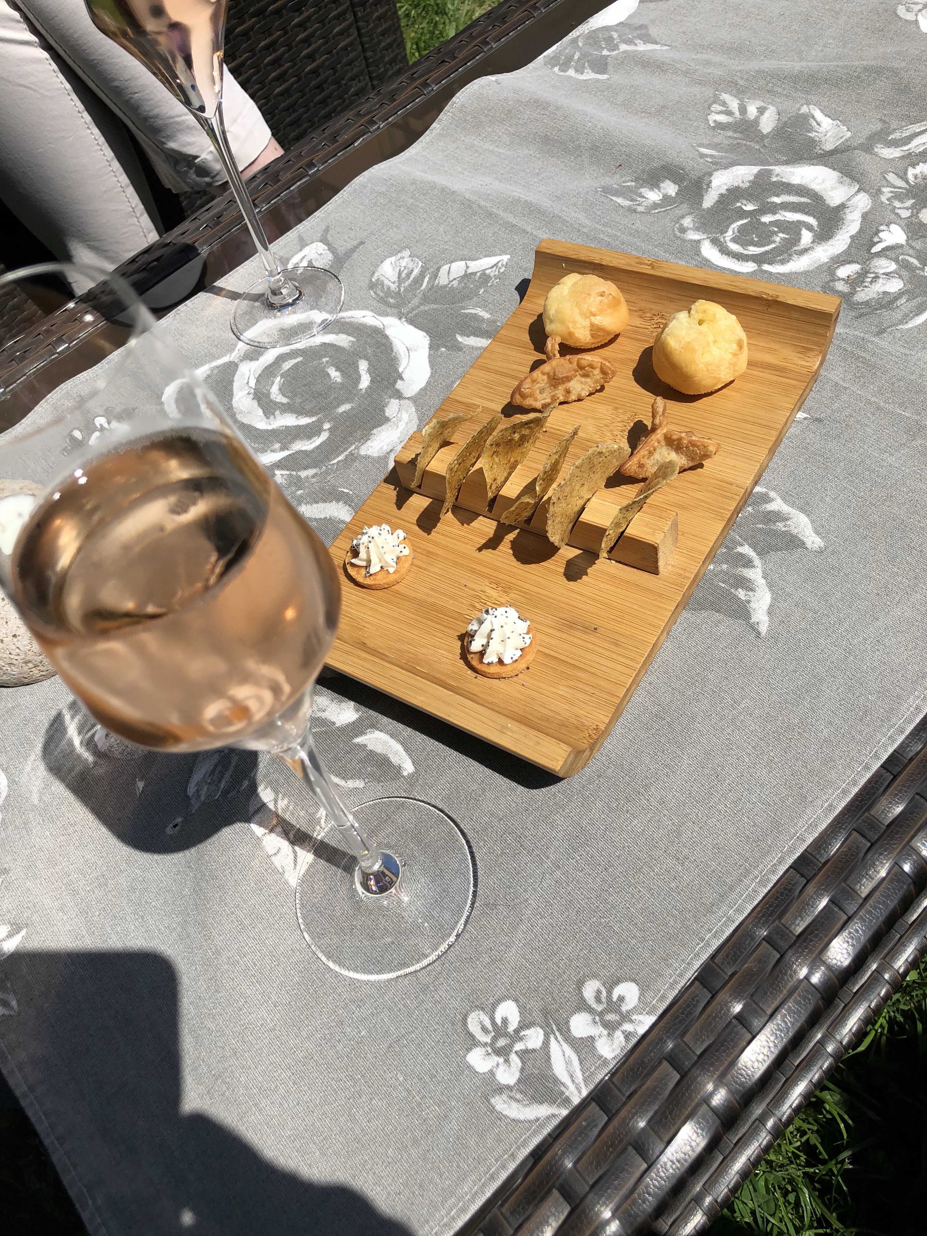 L’aperitivo é servito in giardino: la vista sul paesaggio è deliziosa. Con uno spumante aromatizzato alla violetta (a mò di Kir, ma più fine) ecco degli ottimi snacks/salatini. Spiccano un ottimo bignè al Castelmagno, delle tegole di mais ed un sablé al Parmigiano.