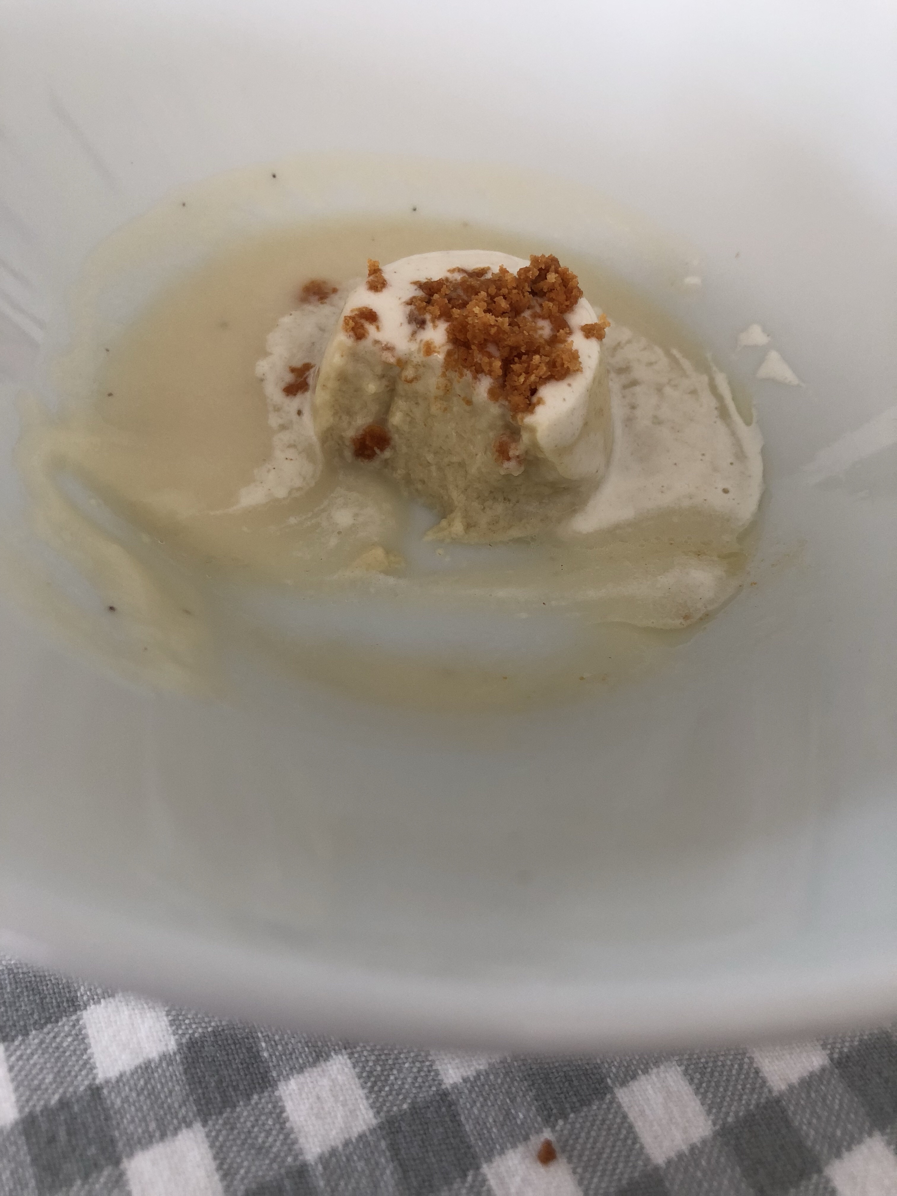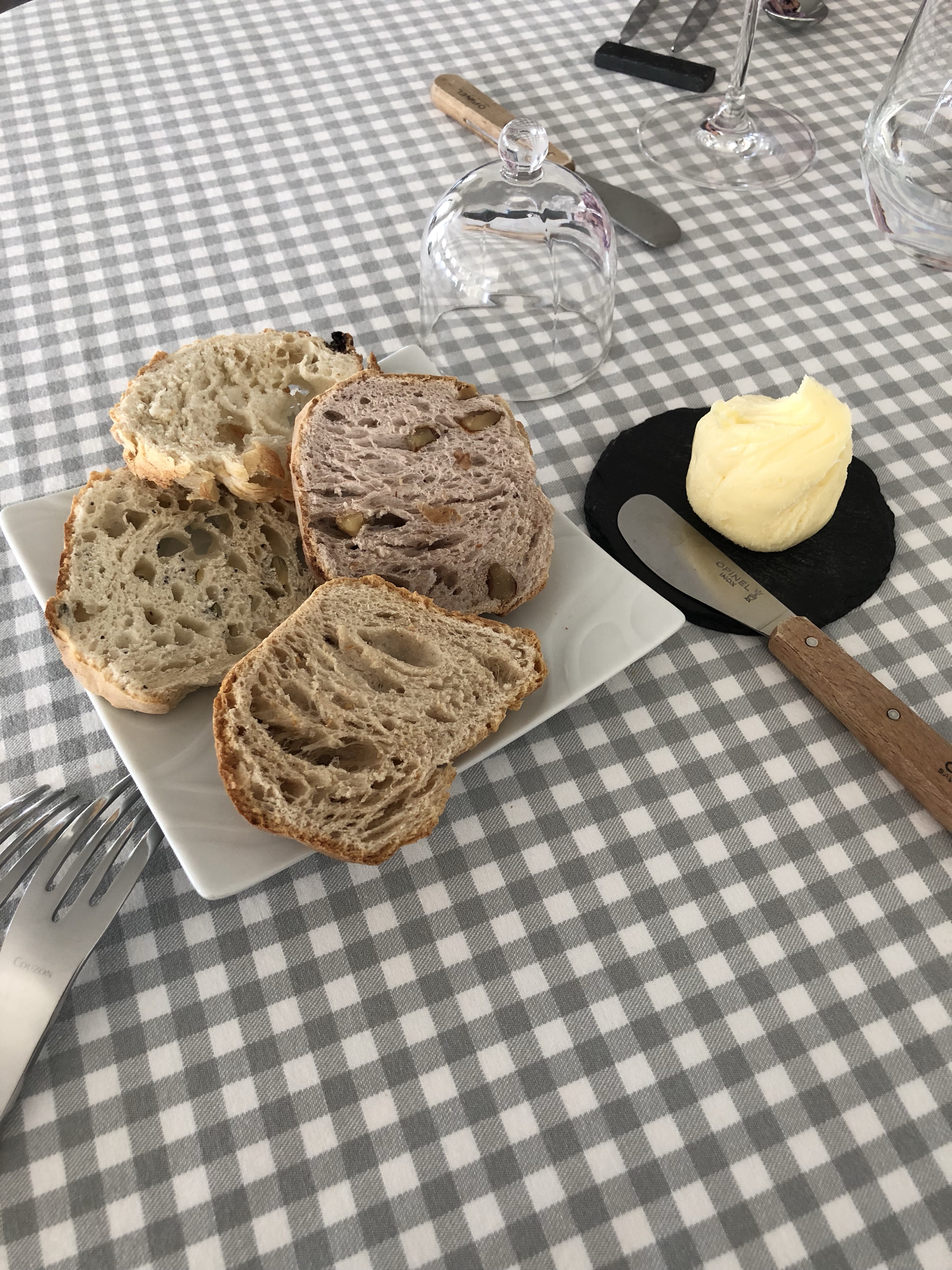 Iniziamo con il pane: Jérôme lo prepara con lievito madre di 12 anni nei forni a legna dei primi del 900 adiacenti alla struttura. È un pane di altri tempi, per cui eccezionale! Già qui siamo su un altro pianeta! Oggi 4 tipi, al Kamut, alle noci, con le uvette. Servito con beurre demi-sel da spalmare con il coltello apposito Opinel!