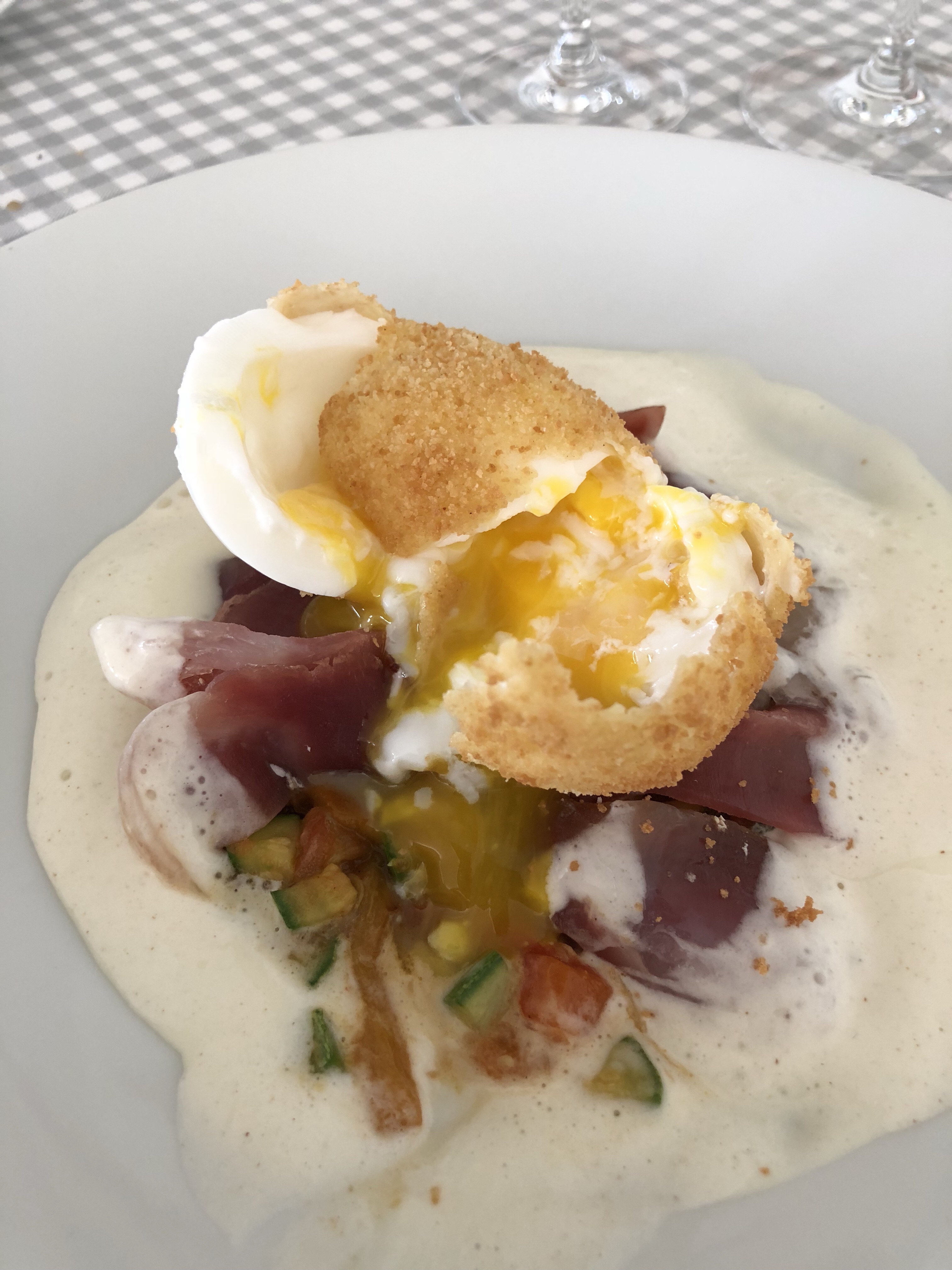 -Uovo barzotto ‘a modo mio’. L’uovo é impanato, servito con scaglie di prosciutto crudo su verdure (peperone in primis) e crema di parmigiano. Insomma…una sorta di Piperade Basque in versione più elegante.