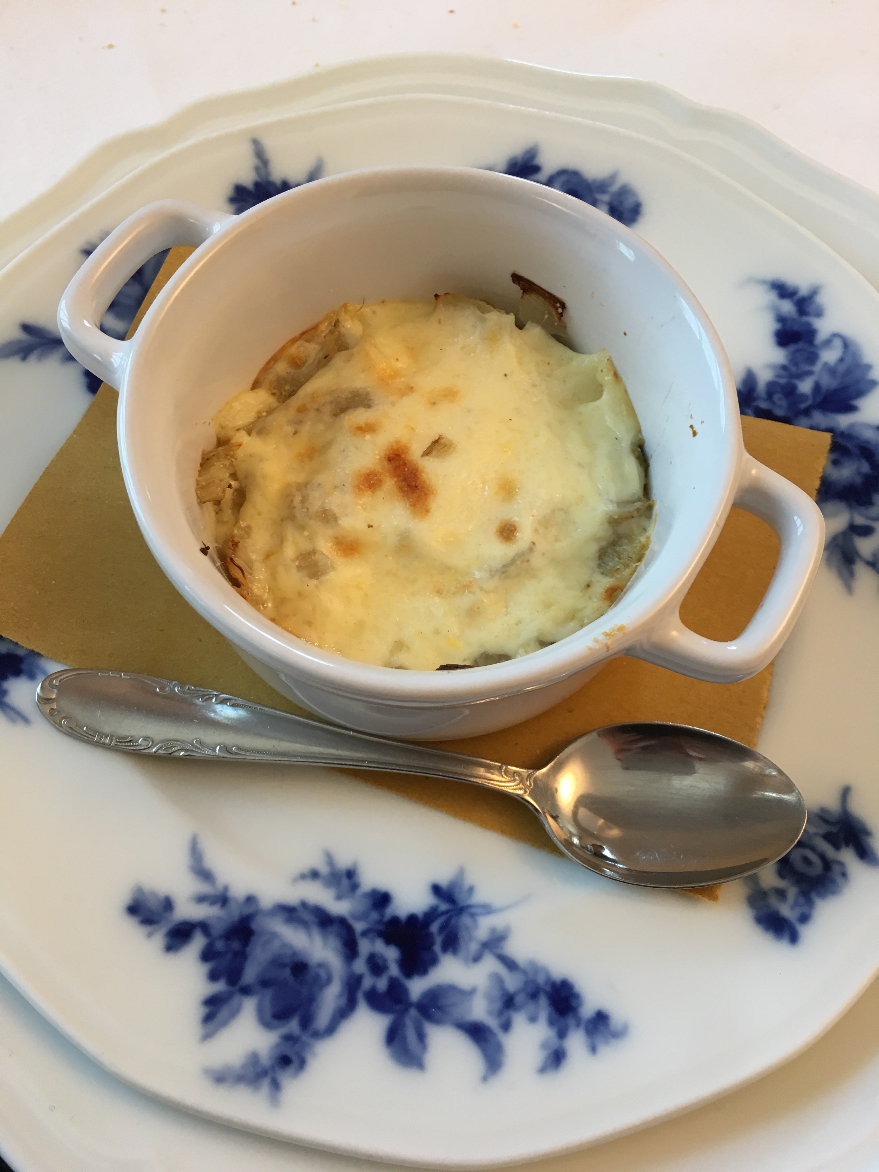 Gratin di cardi e fonduta di fontina d’alpeggio.