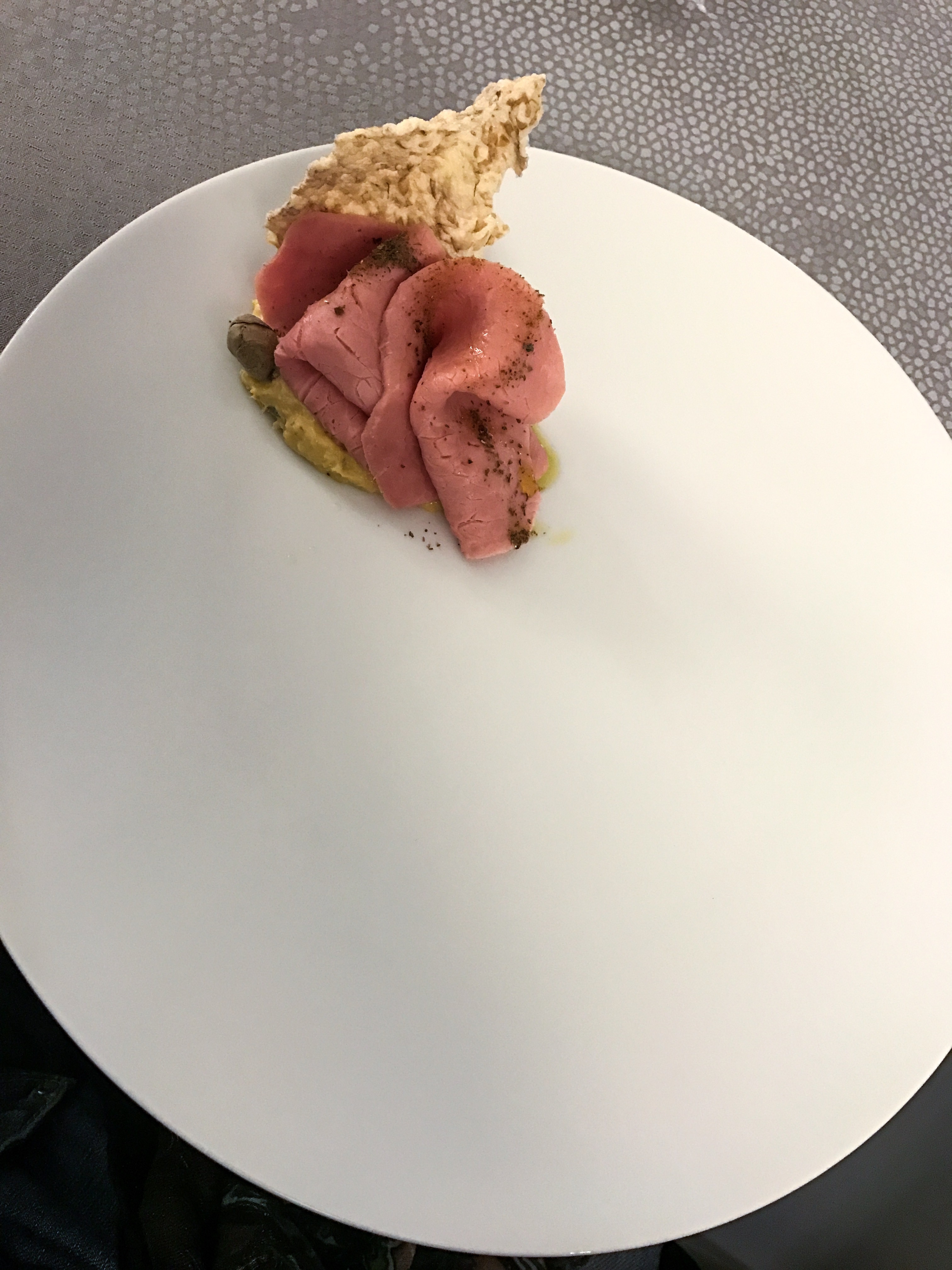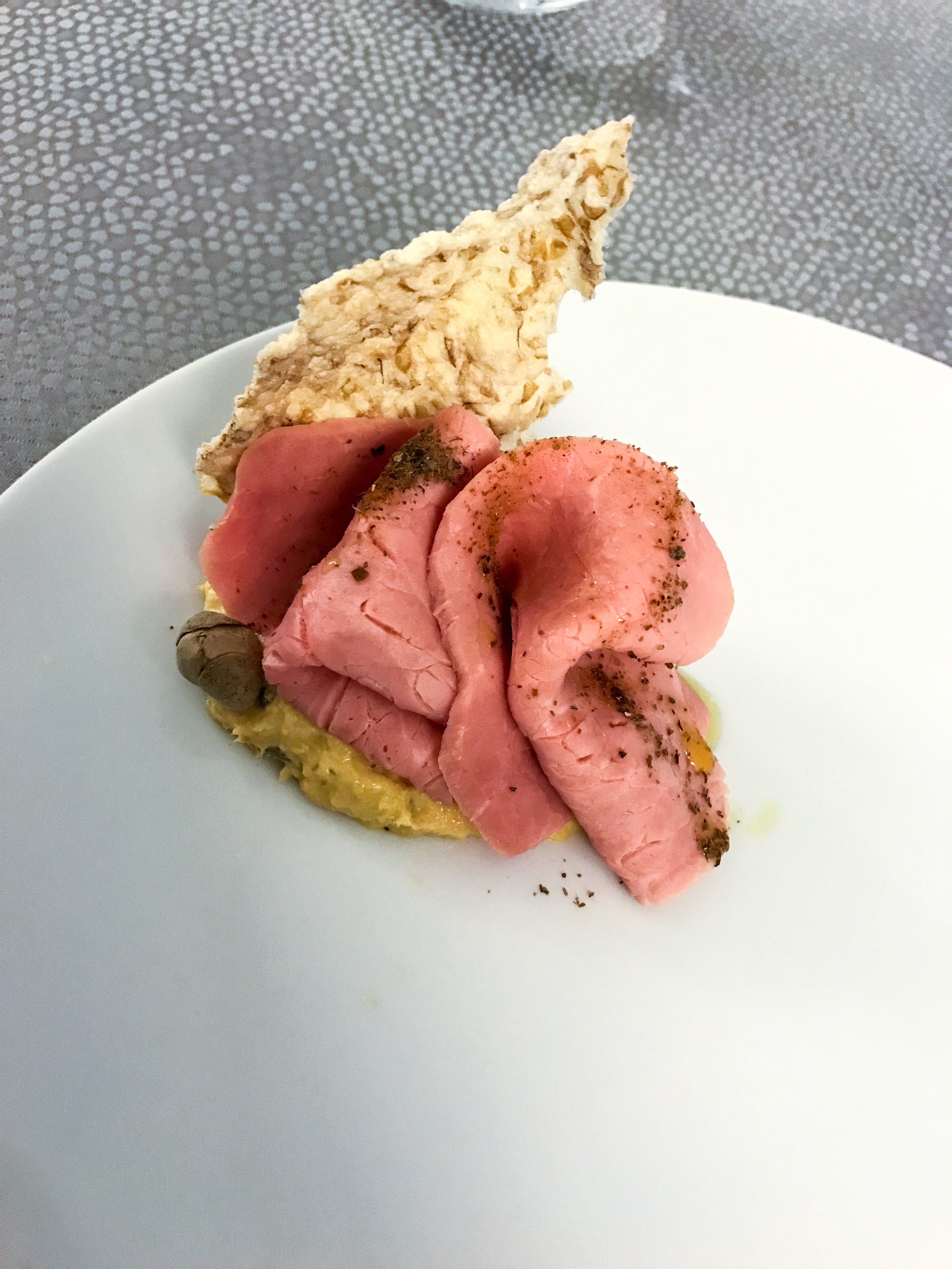 Interpretazione intelligente: fette di carne tagliate più spesse (non come fa Ugo Alciati, ma quasi), salsa densa e materica, cappero disidratato. È uno dei migliori assaggiati in zona.