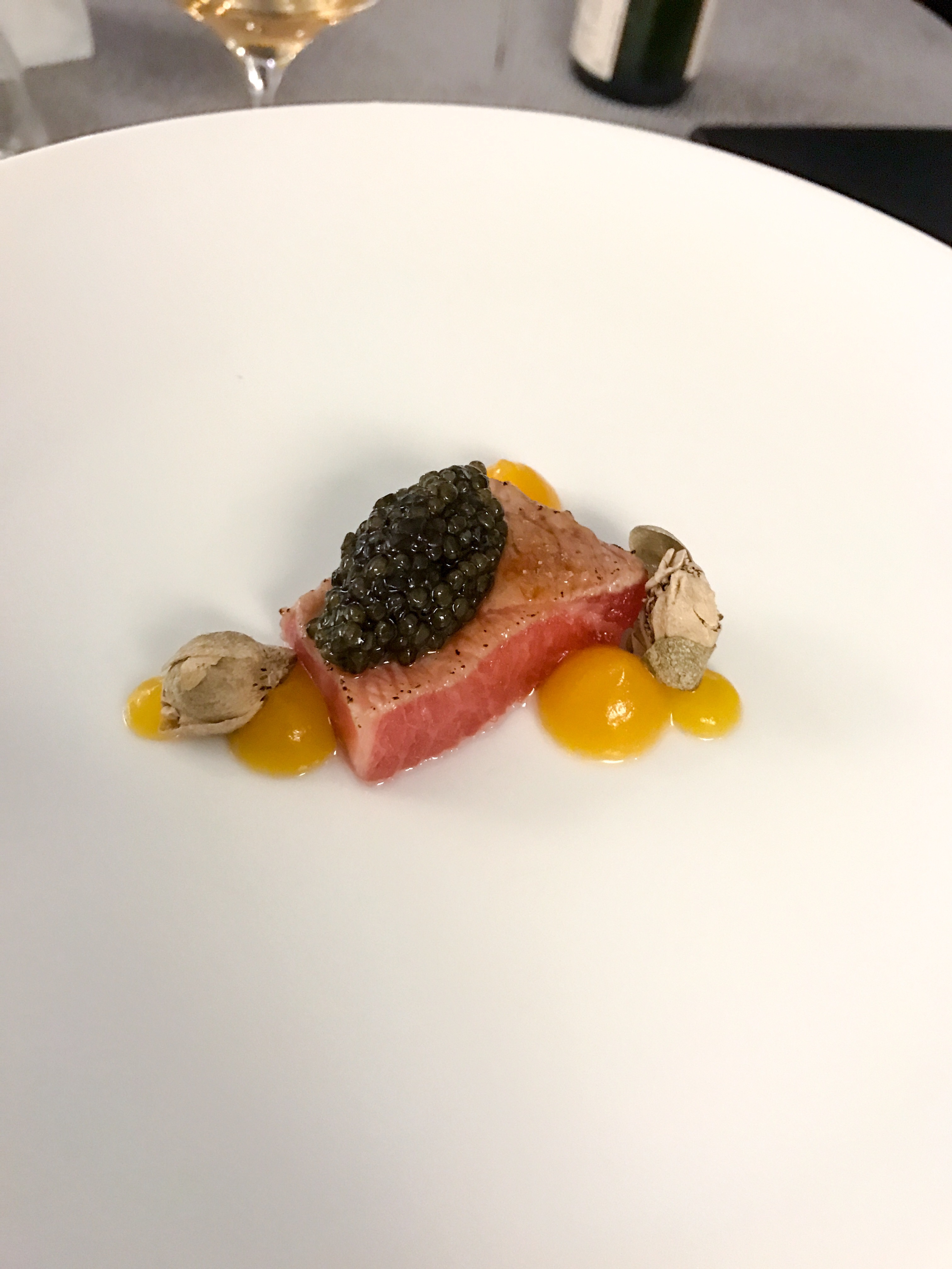 Ventresca di tonno, caviale, coulis di mandarino e cappero disidratato.