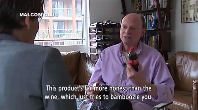 With a bottle of coke in his hand: this is far more honest than the wine, which tries to bamboozle you. (I agree 100% and I’ve always used the same example).