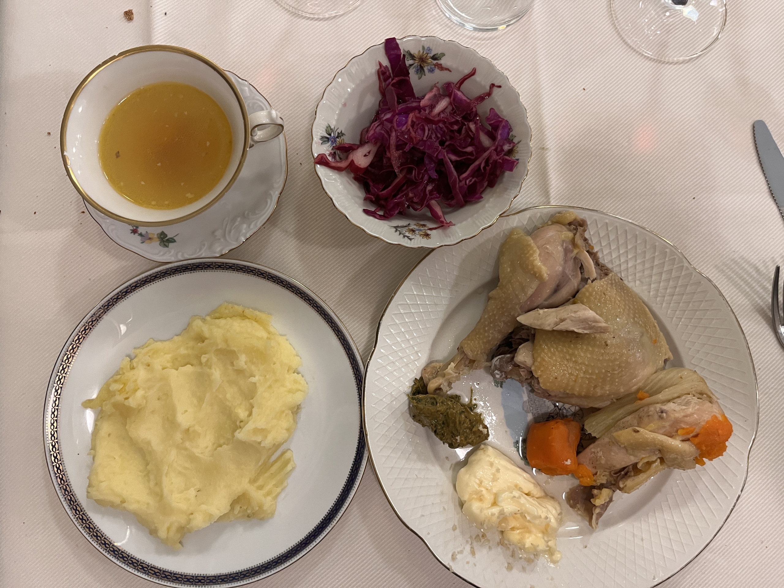 -Secondo: gallina bollita, salsa verde (interpretazione personale, spessa, non liquida né troppo frullata), maionese al rafano (buona ma avrei osato di più con il rafano). Servita con il suo brodo (la classe!), insalatina di cavolo rosso (condita solo con aceto di mele) e purée (burro buono).