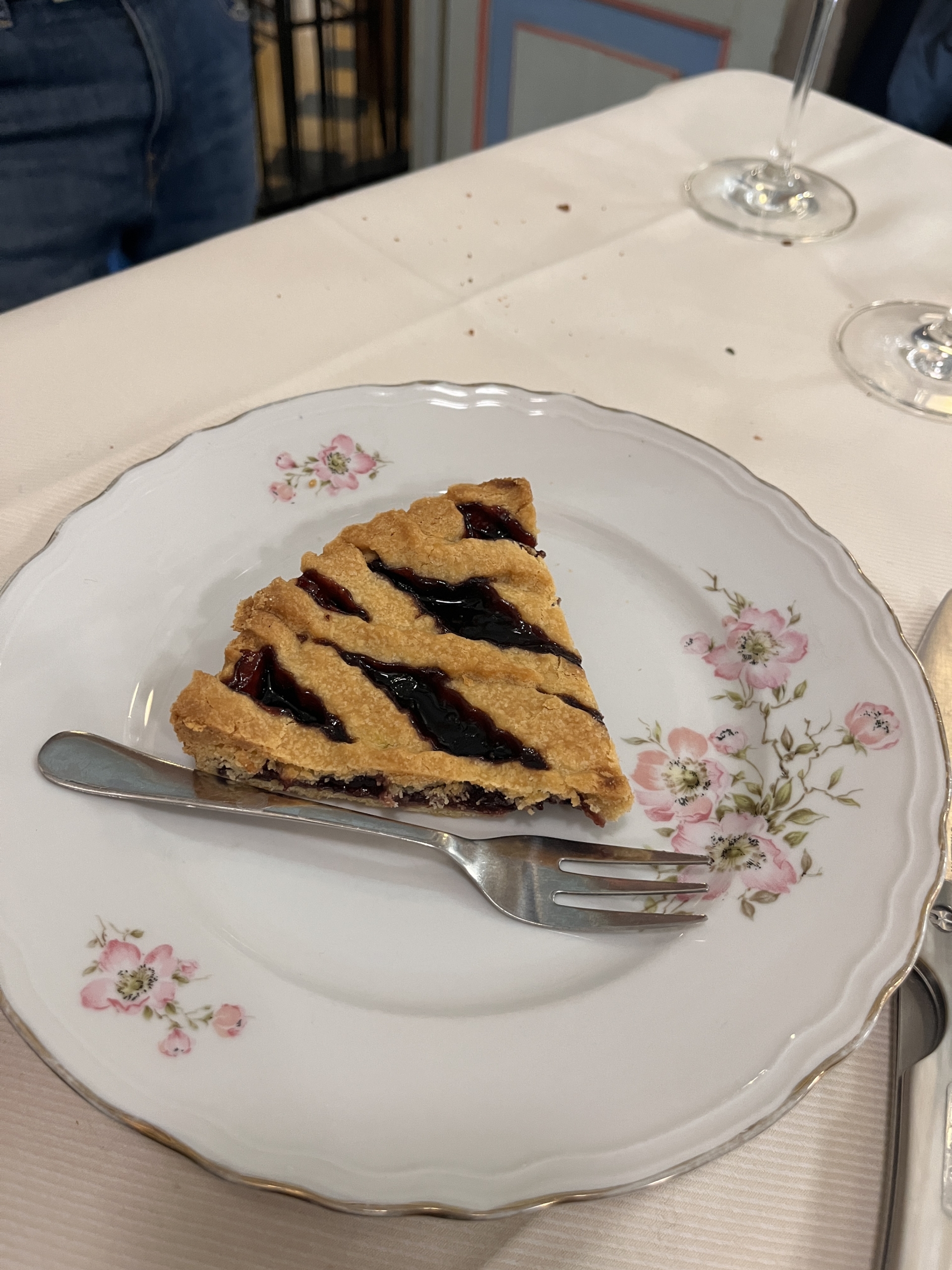 -Chiudo con fetta di crostata con marmellata di ciliegie. Anche qui bene il burro.