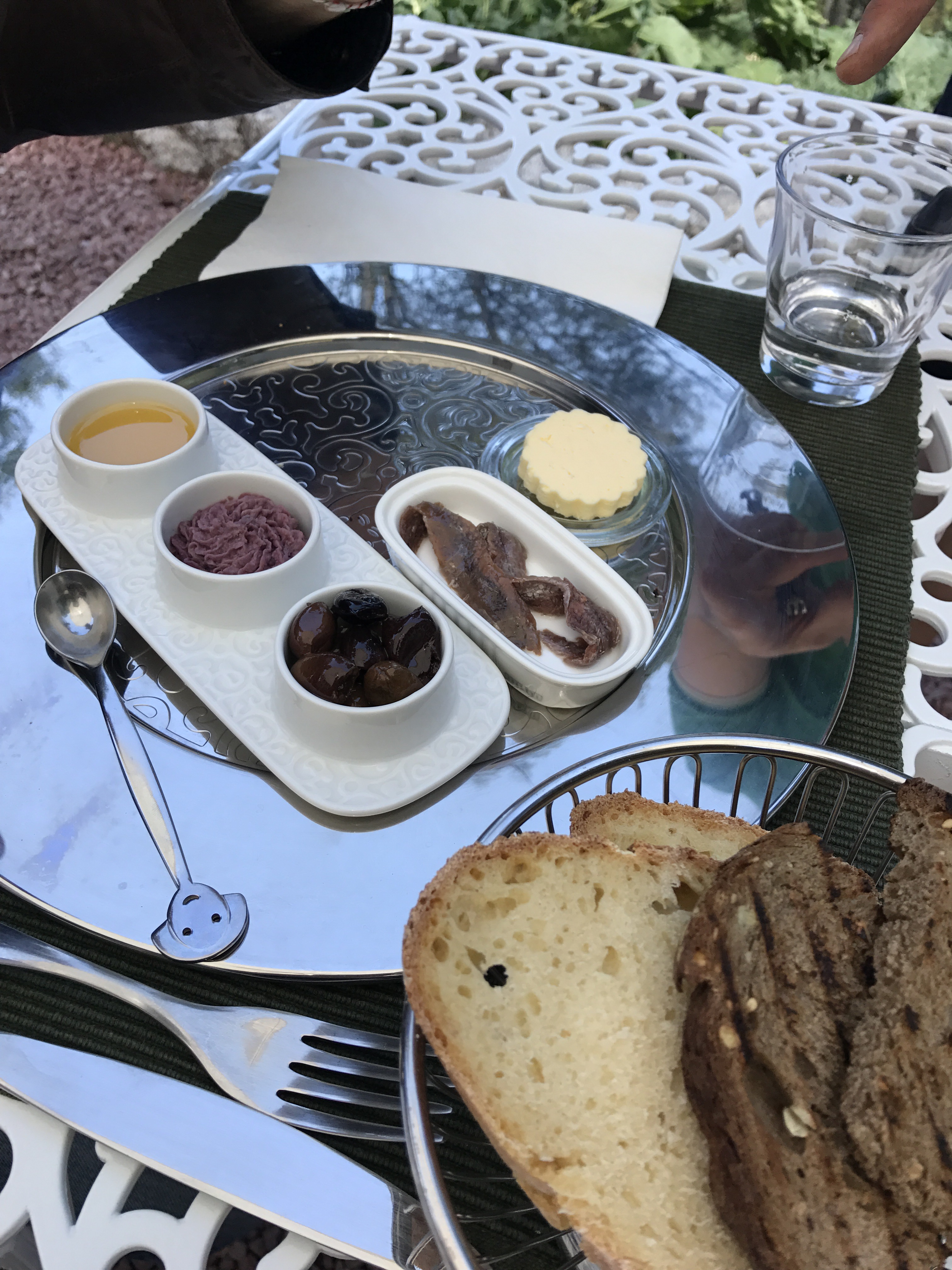 Pani fatti in casa (ottimi), burro d’alpeggio (del Mottarone, davvero buono: una chicca!), olive taggiasche, acciughe, hummus di carota viola del loro orto, ed olio di nocciole appena spremuto in cucina. Usano le nocciole di Cascina Tavijn di Scurzolengo AT, le stesse che ogni tanto servono col caffè al rist. Consorzio di Torino: sono talmente buone che…sono migliori di quelle più famose dell’Alta Langa. Per cui quest’olio di nocciole è davvero notevole, perché appena franto e perché hanno usato nocciole migliori.