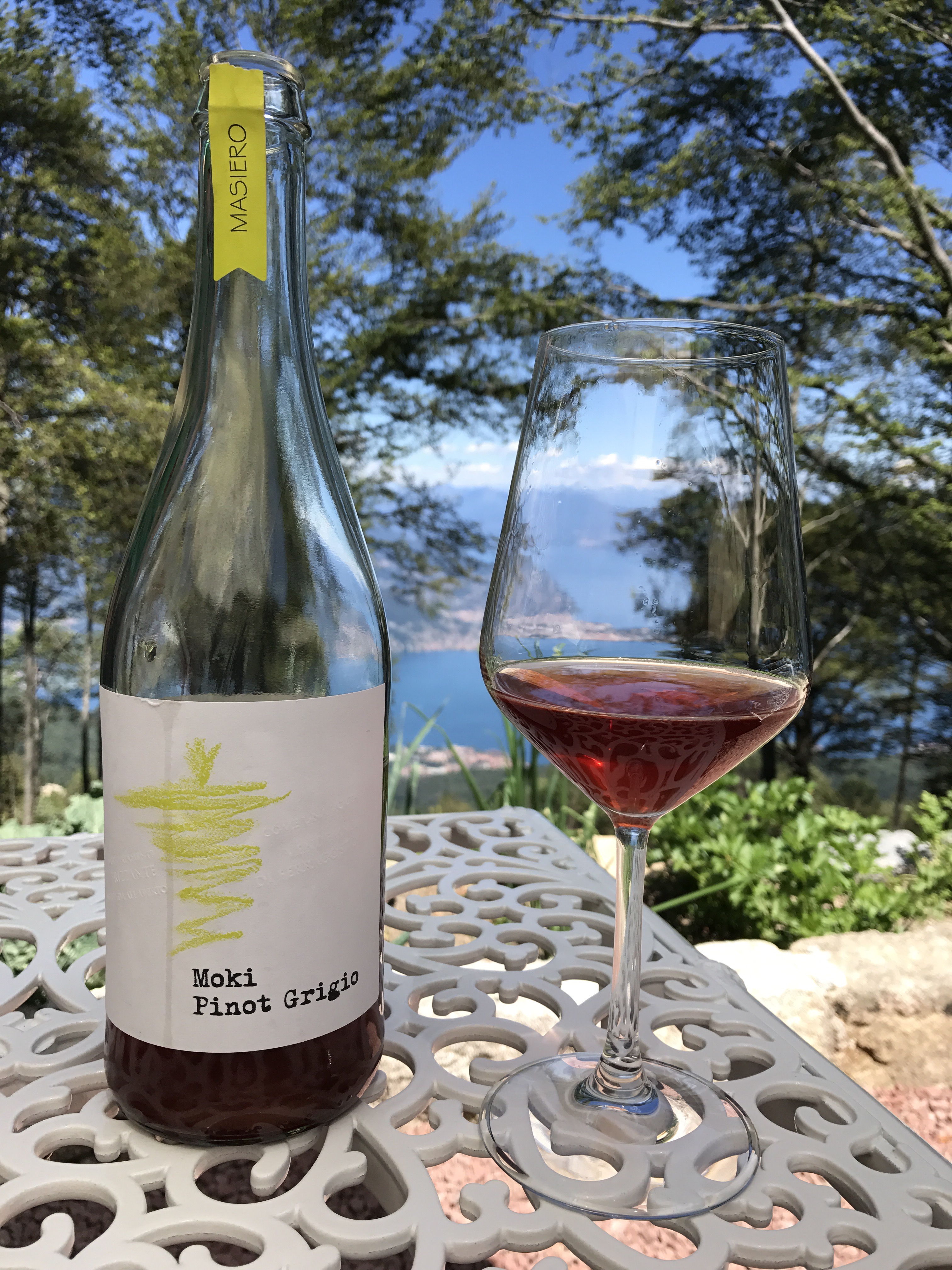 Ci ha consigliato un vino dell’amico Franco Masiero che non conoscevo: il Pinot Grigio ‘Moki’, frizzante, sullo stile di un metodo ancestrale. (Franco Masiero è quello di Verdugo e di quel Merlot che è il n.1 in Italia). Vino molto piacevole, bel colore, gustoso, profumato…insomma perfetto per la bella giornata odierna.