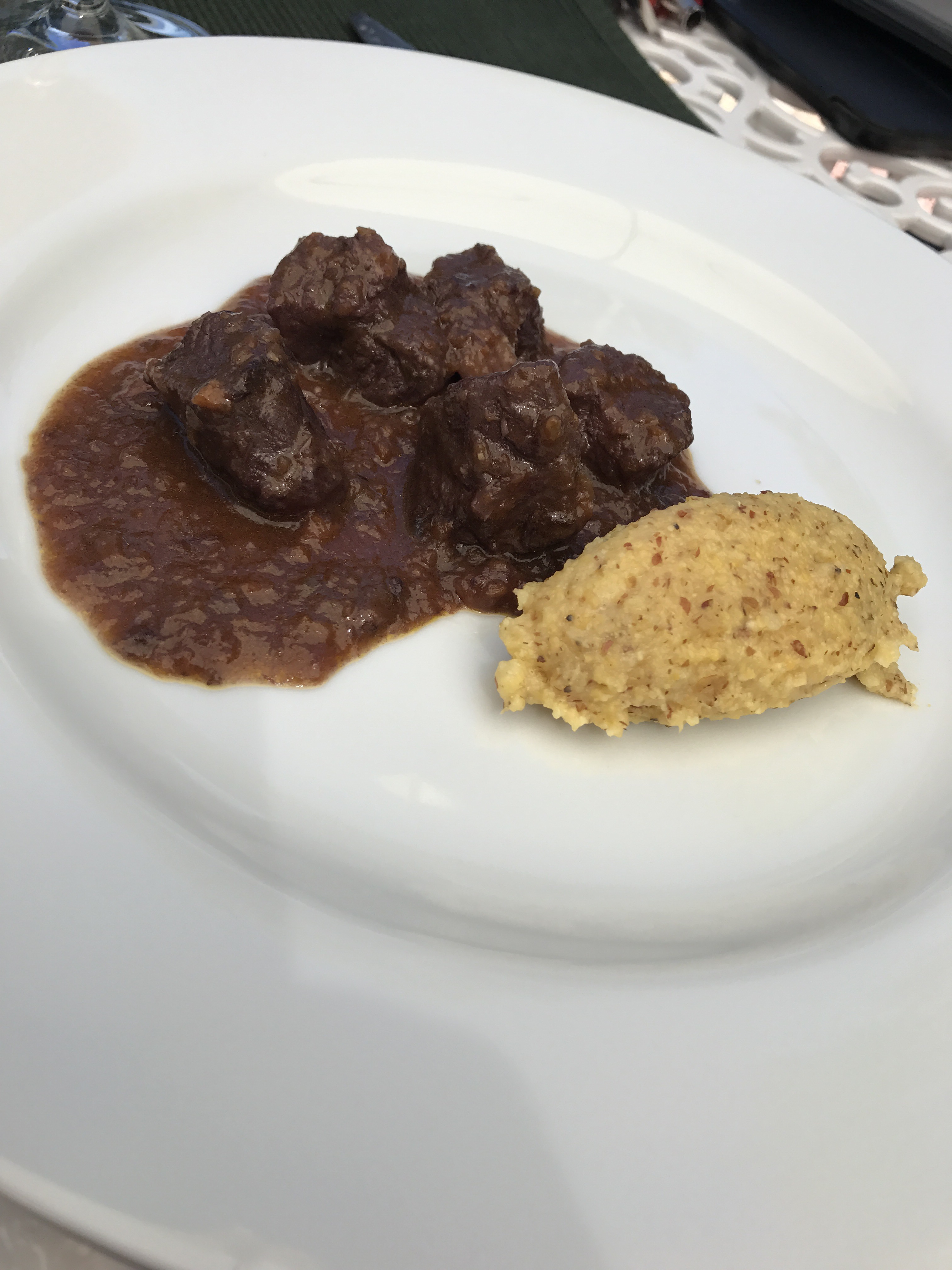Pensate di trovarvi davanti ad uno dei piatti piemontesi più banali? È esattamente l’opposto! Questa giovane cuoca, timida e gentile ha cucinato questo piatto meglio di decine di suoi colleghi scafati e….diciamolo pure: sempre in difficoltà su questa preparazione. Questo piatto è un esempio, un paradigma. La scottona Piemontese è ottima e rimane morbida, ça va sans dire, ma è l’intingolo a fare la differenza! Un bel trito di verdure, il vino dosato in maniera sapiente (deve solo dare un po’ di gusto alla salsa e non il contrario, cioè un brodo di vino con un po’ di salsa di cottura della carne!). Un gusto originario. Un vero piacere! (Digerito senza problemi, ma non avevo dubbi). Polenta di mais Marano squisita.
